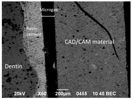 In the oral environment, significant tensions can be developed at the cement/material interface during thermal changes that can result from the daily diet. Moreover, the hydrolysis of the resin cement due to moisture may lead to the disruption of the monomer bonds, attributed to the action of water. These conditions can weaken the bond between cement and material and may lead to bond failure, the formation of microgaps, and microleakage, as demonstrated in previous reports [23,24,25].