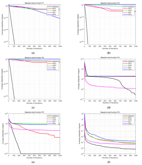 Convergence curves of six selected high-dimensional single-objective test functions: (a) F1, (b) F2, (c) F3, (d) F4, (e) F5, and (f) F6.