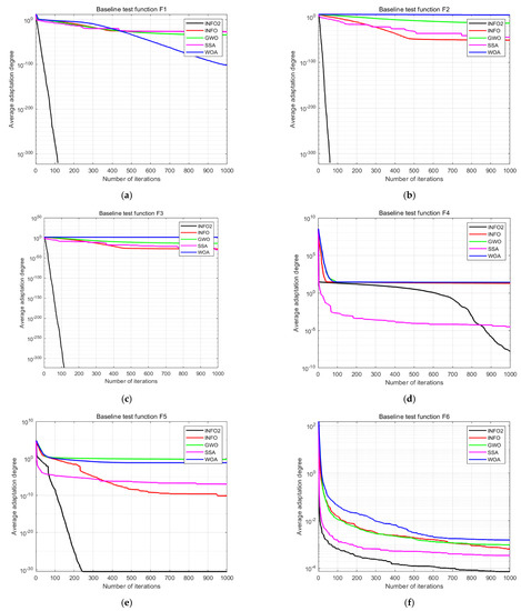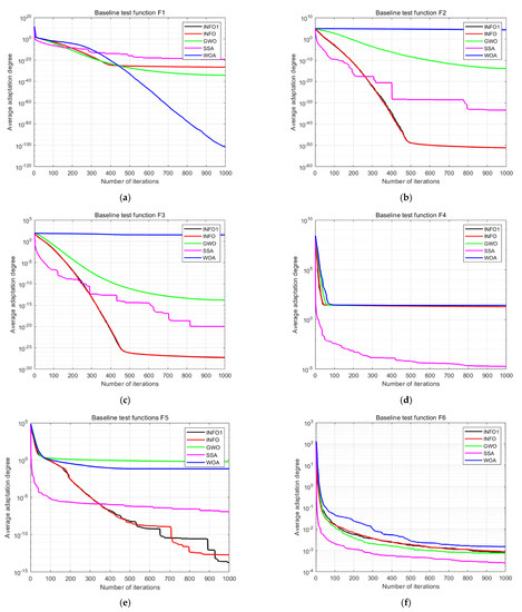 To evaluate our algorithm’s performance, 14 sets of test functions are applied, improvement metrics are tested separately, and we compare our improved INFO model with the SSA, GWO, and baseline INFO algorithms.