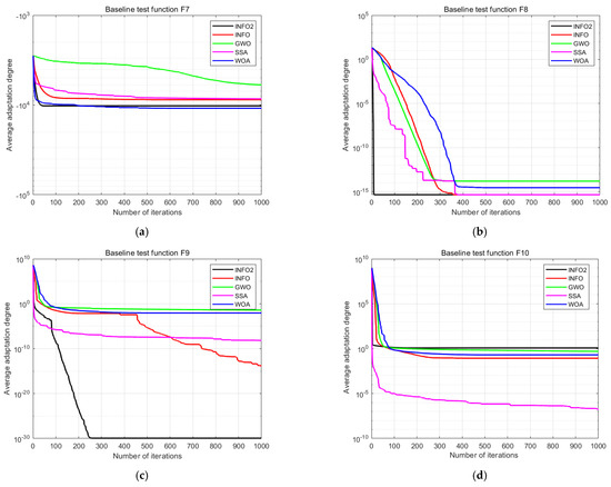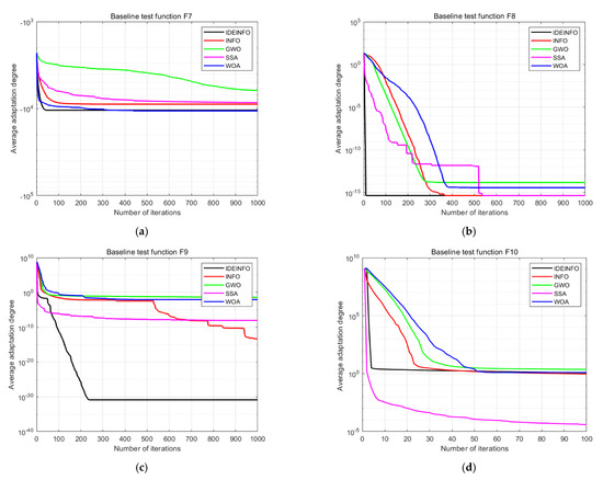 Convergence curves of four selected high-dimensional multi-objective test functions: (a) F7, (b) F8, (c) F9, and (d) F10.