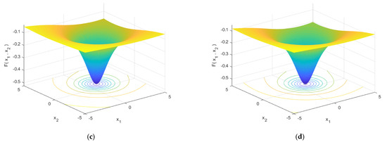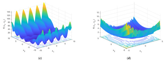 Optimization-seeking space diagrams for four selected low-dimensional test functions: (a) F11, (b) F12, (c) F13, and (d) F14.