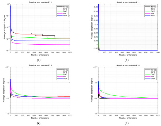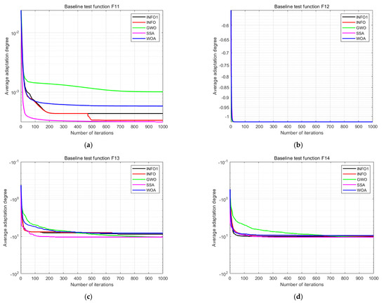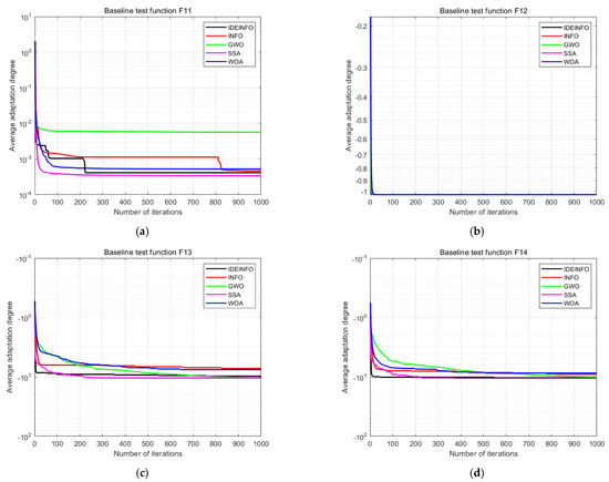 Convergence curves of four selected low-dimensional test functions: (a) F11, (b) F12, (c) F13, and (d) F14.