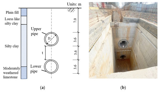 Taking the high-voltage line relocation and reconstruction project in a certain area of Jinan as the background, the project is a 220 kV electric power pipe jacking engineering project. Each pipe segment is a reinforced concrete circular ring with concrete strength of C50. The outer diameter D of the pipe is 3.6 m, the length of a single segment is 2.0 m and the total length is 1376 m. The whole line of the power tunnel adopts a double-layer overlapping arrangement, and the spacing between the upper and lower pipes is 3.6 m. The section view of the pipe jacking project site is shown in Figure 1. The electric power tunnel crosses the typical soil–rock composite strata in the Jinan area, with silty clay in the upper part and limestone in the lower part. The stiffness of soil and rock is obviously different. The geological profile is shown in Figure 2.
