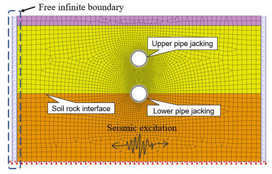 In recent years, a series of numerical analyses and shaking table tests have been carried out on the seismic responses of shield tunnels and mountain tunnels. Chen Lei et al. [6,7] studied the horizontal nonlinear seismic response characteristics of the double-layer shield tunnel under near-field and far-field earthquake action and strong ground motion near the fault. Yang Ningbo [8] studied the influence of two parallel tunnels in the horizontal direction and vertical direction on the tunnel dynamic response and ground peak acceleration at different intervals. However, the above study only analyzed tunnels in homogeneous soil stratum. Zhang Wenjun [9] and Yu Yishu [10] reported that tunnels located in the homogeneous soil layer are relatively safe even if they are affected by a strong earthquake. However, under complex geological conditions, the stratum displacement and strain response of the tunnel caused by the earthquake is different from that of homogeneous stratum. Yin Yunteng et al. [11] analyzed the failure mechanism and relevant seismic measures of the Qingdao subsea tunnel structure at the soft–hard junction. Wang Wei [12], Zhang Jing [13], Liang Jianwen [14] and Cui Guangyao [15] carried out shaking table tests, obtained that the shield tunnel obtained the maximum internal force at the sudden change of soft and hard strata and pointed out the weak position of the longitudinal seismic resistance of the shield tunnel structure, respectively. At present, the seismic research of underground engineering mostly focuses on urban subway shield tunnels, subway stations, comprehensive pipe galleries and mountain tunnels [16]. For a large-diameter double-layer pipe jacking tunnel in complex soil and rock combination stratum, the difference in the stratum conditions and interaction between the pipe jacking tunnels may make its internal force more complex. At present, there are few relevant studies that reasonably consider the above factors.
