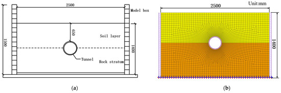 In order to verify the reliability of the above numerical method, a calculation model by the numerical method is firstly used to simulate the shield tunnel shaking table test [22]. The scale model experiment was conducted in the Structural Engineering Laboratory of Shandong Jianzhu University, as shown in Figure 5a. In this experiment, a multi-channel hydraulic servo drive is used to simulate control and the model box is a layered shear box. In the model experiment, gypsum and admixture were selected as the structural materials of the tunnel model and the soil layer was original silty clay. The hard rock model was prepared with quartz sand as the skeleton material, Portland cement and gypsum as the cementing material and was made by uniformly mixing and vibrating according to the mass ratio. The physical and mechanical parameters of the materials are obtained through the mechanical and geotechnical tests.