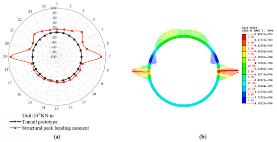 The finite element model of the shaking table test was established by using the numerical method adopted in this paper, as shown in Figure 5b. In order to make the seismic waves inputted by the numerical model consistent with the seismic waves inputted by the test, the acceleration time history record of the shaking table is used as the seismic excitation of the numerical model. Considering that there are many experimental conditions, some experimental conditions are selected for numerical simulation to compare experimental results and numerical calculation results. Due to the peak bending moment diagram of the tunnel structure obtained from the shaking table test (Figure 6a), we selected the peak bending moment diagram of the tunnel structure to compare the results. It is concluded that the change trend of the structural bending moment obtained from the numerical simulation and the model test is basically consistent, which proves that the calculation method and boundary conditions adopted by the numerical method are reliable and can be used for subsequent numerical research.