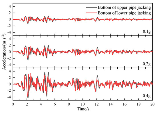 To investigate the seismic response of the double-layer pipe jacking structure under different ground motion intensities, the acceleration time history curves of the bottom of the upper and lower pipe jacking tunnels under the action of El Centro waves with three different peak accelerations are shown in Figure 7. It can be seen that: