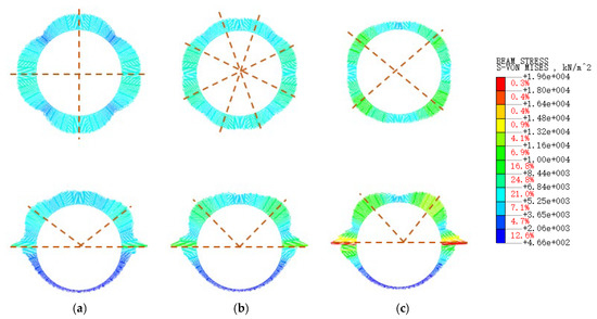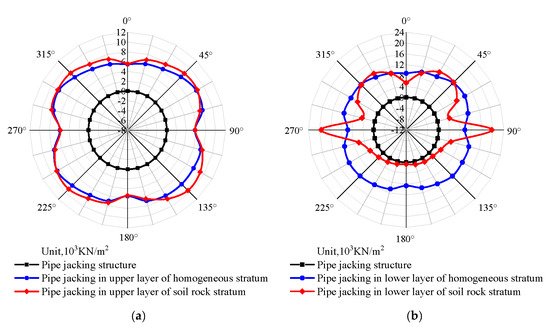 The polar coordinate distribution of peak stress was calculated, as shown in Figure 12. The stress of the upper and lower pipe jacking structures under two site conditions are compared and shown. It can be seen from the figure: