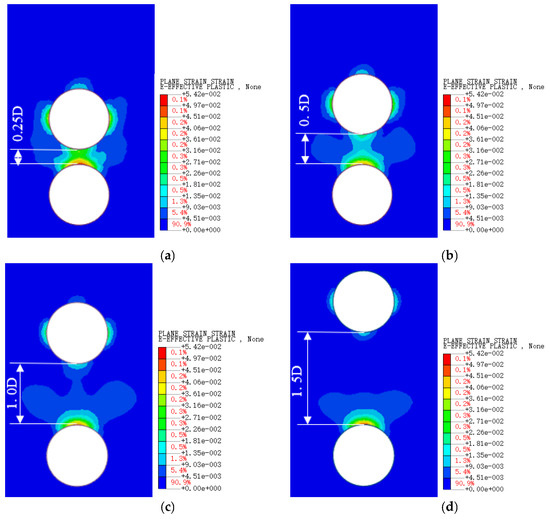 Effective plastic strain distribution of soil between vertical double layer pipe jacking with different thickness of soil interlayer: (a) 0.25 D; (b) 0.5 D; (c) 1.0 D; (d) 1.5 D.