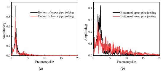 Spectrum curves of the bottom of pipe jacking at different stratum: (a) Homogeneous silty clay stratum; (b) Soil–rock combination stratum.