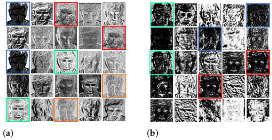 To alleviate the problem of the excessive number of parameters and computational effort associated with complex DCCNs, a series of methods have been proposed to build efficient and lightweight convolutional neural networks, such as knowledge distillation [12,13], networks pruning [14,15], and quantization [16]. In addition, recent research has focused on building efficient convolutional networks with fewer parameters and computational effort and has achieved great success. Several works [17,18,19] propose the construction of efficient modules to design lightweight convolutional neural networks. Depthwise separable convolution operations and inverse residual structures are used to construct efficient modules in MobileNet [17,20,21] and obtain competitive performance. To achieve state-of-the-art performance, channel shuffle operation is utilized in ShuffleNet [18]. Although these methods achieve lightweight convolutional neural networks with low computational cost and a low number of parameters by designing efficient units, they do not take redundant information in features into account. For example, as shown in Figure 1a,b, we mark similar features with the same color. GhostNet [19] employs ordinary convolution to generate intrinsic features, followed by inexpensive linear transformations to produce ghost features. The ghost feature reveals sufficient information about the intrinsic features and is able to reduce convolutional consumption with similar recognition performance. Nevertheless, the direct use of the ghost module in face recognition can lead to a significant degradation in model performance. We, therefore, reconstructed an efficient model called GhostFaceNet, based on the ghost module, which significantly reduces the number of parameters and the amount of computation without noticeably degrading performance.