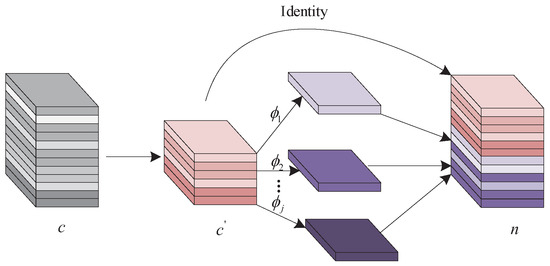 where n is the number of channels of the final output feature. Feature information and intrinsic features are connected together to output the final feature information. The operation flow of the ghost module is shown in Figure 2.