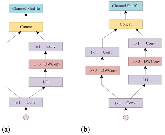 According to ShuffleNetV2 [18], we set for all modules, to reduce memory access cost(MAC). The feature information of the two branches is connected by the concat operation and finally output by the channel shuffle operation to allow the communication of the different channel features.