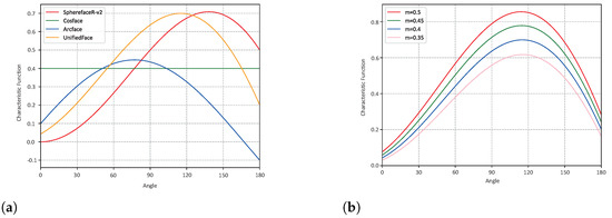 From Figure 4b, we can observe the change in the trend of UnifiedFace at different m in detail. The characteristic functions at different values of m all follow the angular margin minimum for simple samples and maximum for medium hard samples. Meanwhile, a sufficiently large angular margin is given for hard samples. Compared with other popular loss functions of characteristic functions, UnifiedFace can obtain the maximum angular margin for medium hardness samples. Furthermore, UnifiedFace does not give too much angular margin to hard samples leading to an excessive focus on these hard samples during training compare to SphereFaceR v2.