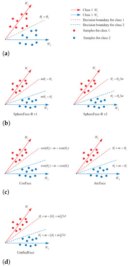 To facilitate understanding, the binary case is considered to illustrate intuitively the uniform additive and multiplicative margins. Figure 5 intuitively compares the no angular margin, multiplicative angular margin, additive angular margin, and uniform angular margin. For a sample x, if no margin is introduced, becomes the decision boundary for class 1, i.e., the decision boundary is , as illustrated in Figure 5a. When both additive and multiplicative margins are introduced, it also means that and . is the decision boundary for class 1. When the sample x belongs to class 1, it is required that . Correctly classifying sample x into class 1 requires , while correctly classifying sample x into class 2 requires . As shown in Table 3, the decision boundary of UnifiedFace is more stringent. That is when the sample x belonging to class 1 is correctly classified, is smaller than the other loss functions of both additive margin and multiplicative margin. The process of UnifiedFace supervise face recognition network is illustrated in Figure 6.