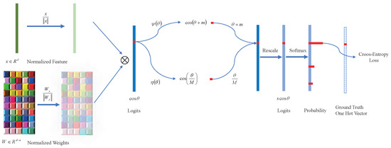 where denotes the angle between the feature and the j-th weight vector. The feature is normalized by normalization and then re-specified as s. The weight is fixed to 1 by normalization.