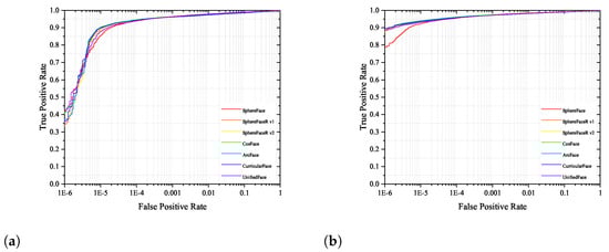 The experimental results in Table 11 show that the experimental results in the large-scale test datasets are consistent with those in the validation datasets. This consistency also indicates the validity of the selected test datasets and models. It is also well demonstrated that the models that obtained good performance in the validation datasets can also achieve correspondingly good results in the test datasets. From Table 11, we can observe that although different types of margins produce similar performance, result in different results at a low false acceptance rate (FAR). UnifiedFace can significantly improve the performance on the IJBB and IJBC test datasets. In particular, at TAR (), UnifiedFace achieves state-of-the-art performance. Moreover, UnifiedFace performs particularly well at other low FAR, which is of great interest for designing robust face recognition. The receiver operating characteristic curves(ROC) of UnifiedFace with other loss functions are given in Figure 8a,b, respectively.