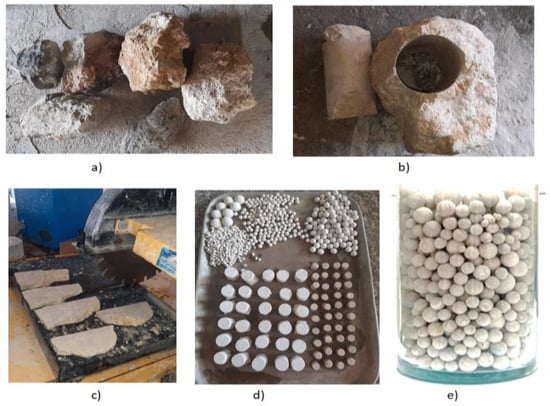 Sequence of transformation activities: (a) original rocks of limestones, (b) cutting cores for mechanical and elastic tests, (c) laminar cutting of rock, (d) spherical shaping of particles, and (e) grouping of shaped particles to make a cylinder of 100 mm × 200 mm.