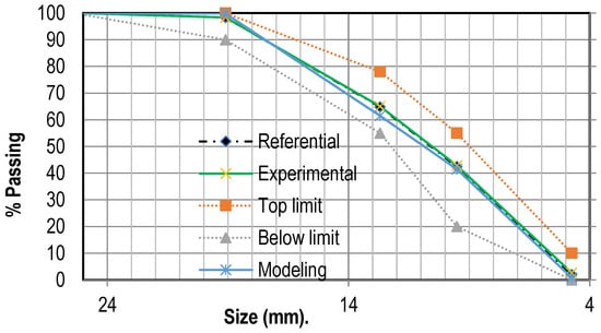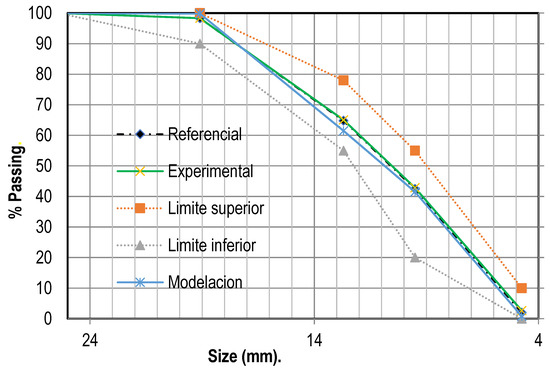 The geometry generated by the model needed to be very close to the experimental one, since the experimental model was required to serve as a comparison to the computational model. For this reason, the similarity between the previous gradations was essential for calibration. Table 7 compares the granulometric values of the referential, the experimental, and the resulting granulometry in the modeling, showing a high precision between the results. On the other hand, Figure 6 shows us the granulometric curves used.