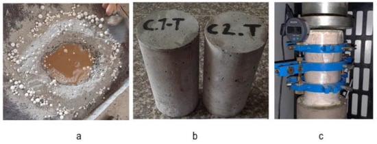 Sequence of final activities: (a) mixing of materials, (b) conformation of concrete cylinders, and (c) elastic modulus test.