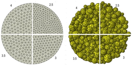 After assigning the properties of the materials obtained in the experimental model, simulations were developed with mesh sizes of 2.5, 3, 3.5, and 4.0 mm, respectively. Because the smallest coarse aggregate particle corresponded to the No. 4 sieve equivalent of 4.75 mm, it was assigned as the maximum mesh size of 4 mm.