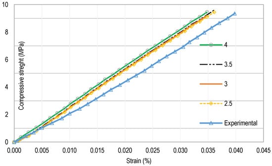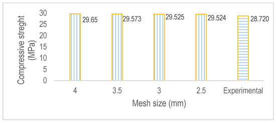 The variations of results in the requested parameters were compared, with respect to the experimental values in Table 10. The differences in the 2.5 mm and 3 mm mesh were presented in the second decimal for the compression stress and in the second decimal for the modulus of elasticity.