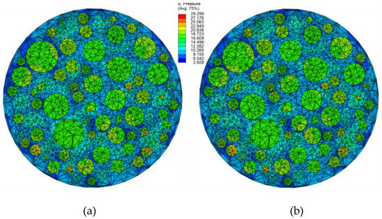 Figure 5 contains the top view of the concrete cylinder; it was desired to show the differences in the mesh, where each quadrant of the associated view was assigned a different size. Each quadrant corresponded to a different mesh and showed an analogous way to appreciate the same effect of the meshing difference on the coarse aggregates. In a first stage, the test was carried out only elastically for each mesh size, where the elastic behavior was selected in Abaqus for both materials. In the second stage, the mechanical behavior was added with the help of the data about creep and plastic deformation, both in the coarse aggregate and in the mortar. The data was obtained in the experimental model, and the modeling was carried out until the failure of the cylinder.