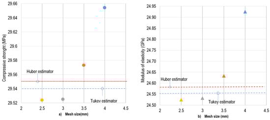 Statistical analysis with M estimators. (a) Applied on compressive strength. (b) Applied on modulus of elasticity.