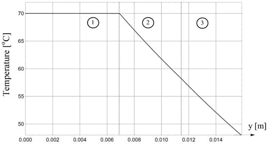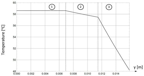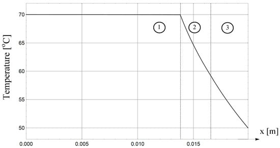- The increase in the thermal conductivity of the middle layer λ2 (e.g., tenfold) substantially changes the thermal field distribution. For the conductor, the temperature drop in the double insulation is almost linear (Figure 2 and Figure 3). In the test model, the temperature drop is continuous by sections (Figure 5 and Figure 6). In addition, the maximum temperature decreases from 70.01 °C (Figure 2 and Figure 3) to 58.62 °C (Figure 5 and Figure 6). This is due to better heat dissipation with the increase in λ2.