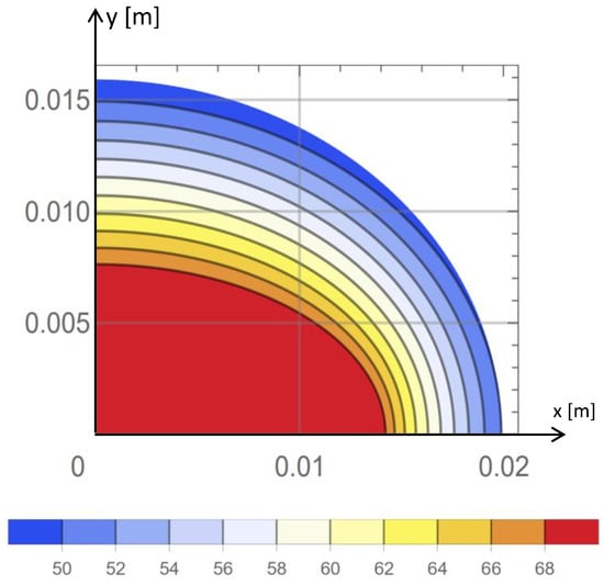 Equation (33) was solved iteratively. Taking into account the data set (32), Icr = 553.51 A was obtained. Then, with the current value given above, the respective field distributions in the elliptical conductor were determined. The corresponding field distribution were plotted in the Cartesian coordinate system x = c∙coshη∙cosψ, y = c∙sinhη∙sinψ. Figure 2 and Figure 3 illustrate the variation of temperature, respectively, on the major semi-axis (y = 0, Figure 2) and on the minor semi-axis (x = 0, Figure 3) of the ellipse η = η3. In turn, Figure 4 shows the two-dimensional distribution of the temperature field in the first quarter of the conductor cross-section with the current given above.
