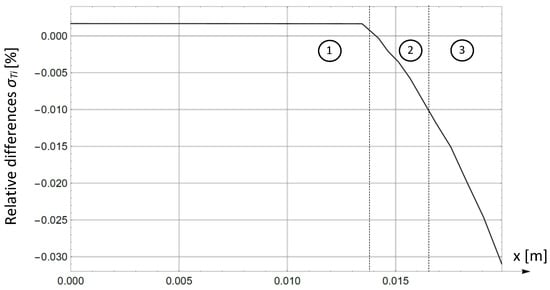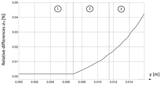 The verification of the presented method was also performed. For this purpose, using the finite element method [], problem (1)–(5) converted to temperature was again solved. Next, the relative differences in temperature increments were calculated from the formula