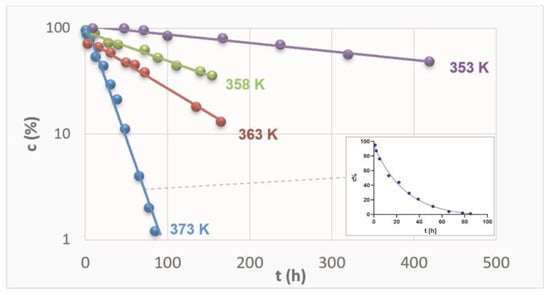 Figure 2 demonstrates kinetic curves for RAM degradation at four different temperatures. It also demonstrates one logarithmic plot for a series at T 373 K as an example. For each experimental series, the gradual loss of RAM in stressed samples was confirmed. Furthermore, the higher the temperature, the more rapid the reaction was, as expressed by increasing slopes of the kinetic curves. The dots represent the contents of RAM (c%) in respective samples stressed under denotated temperatures for increasing time intervals. The most rapid loss of RAM was observed at the highest temperature tested (T = 373 K), as the corresponding concentrations established by validated HPLC were the lowest. At lower temperatures, the decrease in RAM content in stressed samples was relatively less rapid. The F-test was performed for each linear regression and the obtained p-values confirmed that the correlations were significant and slopes were different from zero (Supplementary Material Table S2). Therefore, it was shown that the loss of RAM was proportional to time of exposure and its rate positively correlated with temperature level. Consequently, the reactions were found to follow first-order kinetics, irrespective of the temperature level, confirmed by the high correlation between the experimental data (Table 1). They were described by the following kinetic equation: