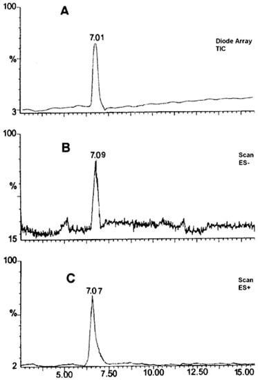HPLC–ESI(+)-MS-TIC (A), HPLC-ESI(−)-MS-Scan (B), HPLC-ESI(+)-MS-Scan (C). Chromatogram for the analysis of RAM degradation impurity (t = 90 h; 373 K) in solid state.