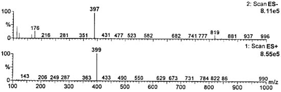Based on the obtained MS spectra, the degradation impurity of RAM was verified. The relevant HPLC-ESI(+)-MS-TIC and HPLC-ESI(−)-MS-TIC chromatograms, recorded using three different scan modes, are provided in Figure 3. All of them show only one signal at tR of about 7 min obtained for a completely degraded sample of RAM under the conditions of dry air (t = 90 h, T = 373 K). It meant that the tested sample contained only one compound, which was identified as RAM degradation impurity. The corresponding mass spectrum, provided in Figure 4, demonstrated one pseudomolecular ion at m/z = 399 for ES+ and at m/z = 397 for ES− (Figure 3). The value m/z stands for mass-to-charge ratio. As per electrospray ionization principle, the ES+ spectrum was obtained secondary to the attachment of one proton to the analyzed molecule, thus the mass of the resulting pseudomolecular ion was increased by the mass of proton [M + H]+ relative to the analyte (thus manalyte = 399 − 1); the charge of the molecule was +1. The ES− spectrum was, in turn, the result of molecule deprotonation [M − H]−; therefore, the mass of the pseudomolecular ion was actually reduced by the mass of proton relative to the analyte (thus, manalyte = 397 + 1); the charge of the molecule was −1. Consequently, the mass of the analyzed compound was established as m = 398 u, as depicted in Table 2.