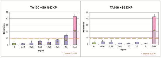 Figure 6 graphically demonstrates the results of the Ames test for the experiments with DKP and N-DKP using the TA100 strain in the setting of metabolic activation. The raw data behind this graph are provided in Supplement S7: Mutagenicity assay results (Tables S11 and S13). The orange dashed line represents a two-fold increase over baseline, over which mutagenic activity was detected. The blue bars correspond to the mean number of revernants found in each concentration. The green bar represents the number of revernants scored for the negative control (solvent) and the pink bar is the positive control. Red asterisks indicate concentrations for which the B-value was above critical at 0.99. For concentrations marked with asterisks but below the dashed line, mutagenicity might be suspected; however, this prediction was not reliable as the criterion of FIB > 2 was the primary one. Only N-DKP, at a concentration of 4.5 mg/mL, following metabolic activation in the TA100 strain, provided a clear positive result for mutagenicity.