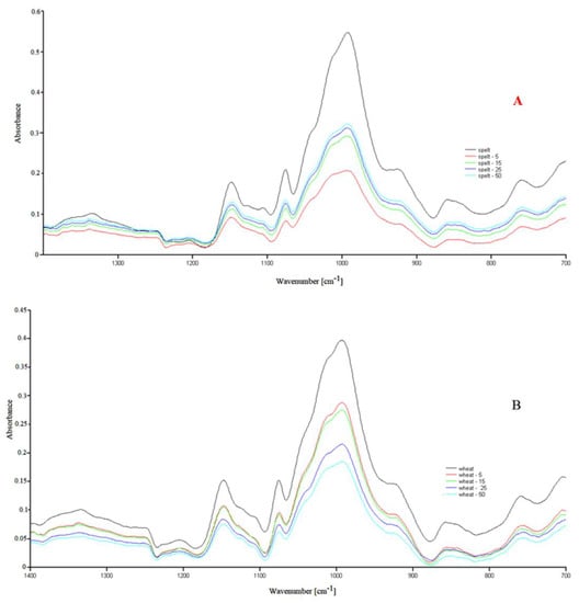 FTIR spectra in the range of 1450–700 cm−1 for the native spelt (A) and wheat (B) and UV irradiated starches.