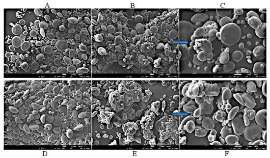 SEM images of the native spelt (A) and wheat (D) starches and of the spelt and wheat starches irradiated for 50 h (B,E, respectively) taken at ×500 magnification and at ×1000 (C,F, respectively).