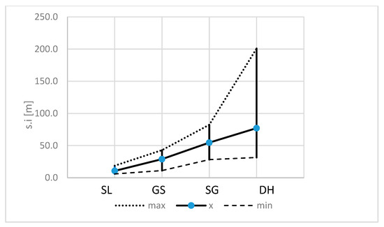 In giant slalom and slalom, the most difficulty emerged based on section distance with f.s scores of 1.74 and 1.06, respectively, with the maximum value for GS as high as 4.87 (which is the highest factor in all disciplines). Short distances make it necessary to complete the bends with a smaller radius and reduce travel time between gates. In speed competitions, short sections of bends occur sporadically and, in principle, cannot be too tricky for safety reasons (high speeds); see