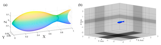 The entire flow field was discretized with a nonuniform Cartesian grid with dimensions of 8 × 5.1 × 5 in the X, Y, and Z directions, using a total of 321 × 341 × 181 ≈ 20 million grid points. The grid was locally refined around the fish with a minimum spacing of 0.005 × 0.005 × 0.005 (Figure 3b). We divided the whole fast-start process into 750 steps. The time interval for the simulation dt was set as 0.0013, so that the entire process had a period T = 0.975 and a characteristic velocity U = L/T = 1.0256, where L = 1 is the characteristic length of the fish model. The Reynolds number is defined as = 4102.4, where = 1/4000 is the kinematic viscosity.