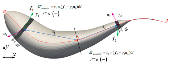 With the data from the CFD simulation, we calculated the internal torque T along the fish body. The internal torque, or the torque exerted by the muscles on the intersection of the body, was calculated considering both the hydrodynamics and the body’s inertia. The internal torque can be calculated on either side from the intersection of interest, as shown in Figure 4. In the figure, f denotes the specific fluid force on element dl, γ is its linear density along the fish middle line, a is the acceleration of the body segment, and r is the displacement from the intersection of interest.