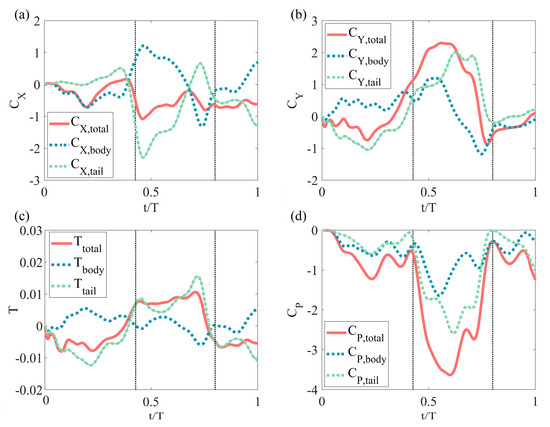 Since the geometry of the fish model is vertically symmetrical, the vertical force distribution cancels out, resulting in zero values for and of the entire swimmer. To analyze the role of the body and tail in the fast-start process, we show the temporal variation of the force coefficient on the whole swimmer, the body trunk, and the tail, as shown in Figure 6. The temporal variation of the force coefficient in the X direction shows several remarkable features. First, the signs of on the body and tail are almost always opposite. The force on the body causes drag, while the tail contributes the thrust. Second, the force coefficient changes gently in stage 1, while it changes steeply in stage 2, with two peaks and troughs. The swimmer’s total force coefficient curve is very close to the tail force coefficient curve, sharing the similar variation trend and amplitude. This means that the tail plays a major role in the force and motion in the Y direction. For torque, because the arm of the lateral force on the tail fin is large, the characteristics of the torque change process are similar to the lateral force, as shown in Figure 6c.
