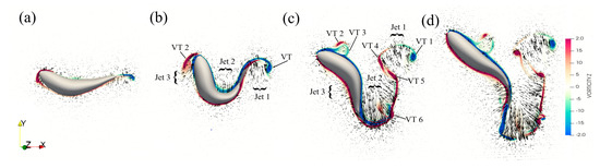 To explore the interaction of the swimmer and the surrounding flow field in a fast start, we analyzed the velocity vector and vorticity of the flow field near the swimmer. Figure 7 shows four typical instantaneous snapshots for specific analysis. In Figure 7a, the fluid near the swimmer starts to flow under the swimmer’s deformation, and two initial vortices are formed near the head and tail. Figure 7b shows a snapshot of the flow field at the moment of switching from stage 1 to stage 2. As the body bends into a C-shape, three jets and two clockwise vortices are formed near the head, waist, and tail. After that, the swimmer enters stage 2 and starts to swing its body in reverse. The head will receive the hydrodynamic force in jet 3, and the tail will receive the hydrodynamic force in jet 1. At the time instant of switching between stage 2 and stage 3, the principle of fluid doing work to the swimmer is similar, which further explains the reason why the swimmer’s output power is significantly reduced during stage switching. Figure 7c shows a snapshot of the flow field at the moment of stage 2 and stage 3 switching. Because the swing speed of stage 2 is faster than that of stage 1, the three jets develop more strongly, and three anticlockwise vortexes, VT4, VT5, and VT6, successively appear at the interface of jet 1 and jet 2, which is similar to the results in [28]. In addition, the vortex induced by the head is clearly captured. In stage 1, the rapid rotation of the anterior part generates a vortex (VT2 in Figure 7b) and induces the flow to move inward to the head (jet 3 in Figure 7b). This VT2 causes the drag and torque that obtrudes the clockwise rotation of the fish. However, in stage 2, the head causes the vortex on the other side (VT2 and VT3 in Figure 7c), and this vortex moves backward along the body (Figure 7d).