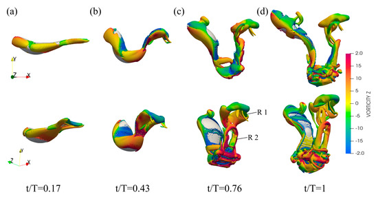 Three-dimensional vortex structures in the flow at four moments of different perspective. (a) t/T = 0.17. (b) t/T = 0.43, the moment of the end of stage 1. (c) t/T = 0.76, the moment of the end of stage 2. (d) t/T = 1, the last moment of the fast start.