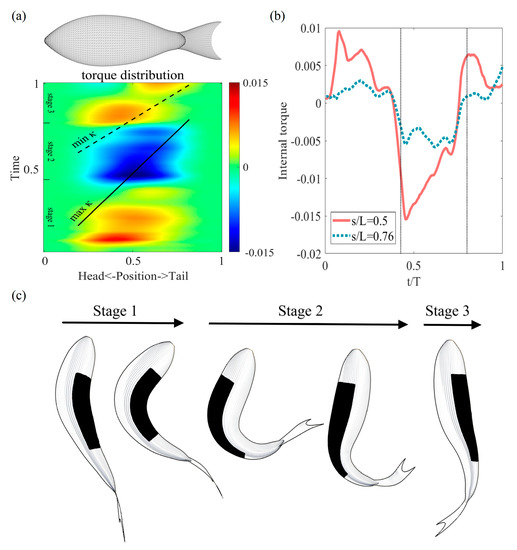 The spatiotemporal distribution of the internal torque to overcome the inertia force and hydrodynamic force is shown in Figure 9a. It can be seen in the figure that the internal torque is mainly distributed in the middle position 0.18L < s < 0.81L, defined by 30% of the maximum value, which means that the main power driving the body to swing in the fast start is the contraction of the muscle in the middle position. The positive and negative values indicate that the muscles on different sides are activated, as the muscle is assumed to be merely able to generate tension. Although muscle activity is also observed on the convex side, its intensity is significantly weaker than that on the bending side [17,18].The black solid line and dotted line in Figure 9a show the spatiotemporal distribution of the maximum and minimum curvature in the internal torque concentration area. The curvature of the initial bending side is positive, and the curvature of the convex bending side is negative. Both the maximum curvature and minimum curvature show an obvious backward propagation trend, and the backward propagation speed (BL/T) of the maximum curvature in stage 1, = 1.005, is smaller than that of the minimum curvature in stage 2, = 1.571. This speed is less than that of the muscle activation, showing the NPL during a fast start. Figure 9b shows the temporal variation of the internal torque at the middle of the fish (s/L = 0.5) and at the peduncle (s/L = 0.76). In addition to the difference in magnitude of these two internal torques, the phase is also different, with the torque having a more advanced phase. The internal torque on the middle body shows a sharp variation between stage 1 and stage 2, and the rapid change in both magnitude and sign indicates the coordination of the muscles on both sides. The torque on the peduncle mainly refers to the torque due to the structure elasticity or viscosity, as the muscle volume is small. In this paper, we do not distinguish this, as the muscles dominate the internal torque. Figure 9c shows the internal torque or muscle activation during the fast start, with the black area indicating the portion where the muscle is activated. It can be seen from the figure that the direction of the internal torque symbol has changed before the end of stage 1 and stage 2, which means that the muscles on the bending side of stage 2 and stage 3 do not start to activate from this stage, but start before the end of the previous stage, which is consistent with the explanation of [29].