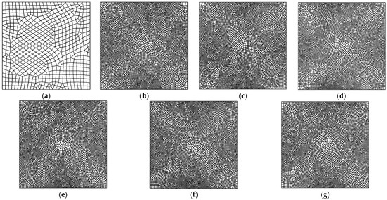 Refined mesh plots in incompressible plate with RPI-recovery techniques considering influence zones and conventional patches (quadrilateral elements original mesh = 30, 4% target accuracy). (a) Mesh (original). (b) LS (conventional patch, ZZ). (c) RPI (conventional patch, MQ). (d) RPI (conventional patch, TSP). (e) RPI (influence zones, MQ, cirular). (f) RPI (influence zones, TSP, cirular). (g) RPI (influence zones, TSP, rectangular).