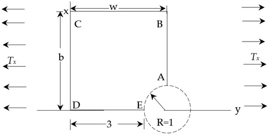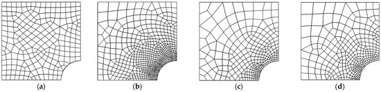 The dimensions of the problem are taken as R = 1 unit, w = b = 4 unit, as shown in Figure 5. The rigid circular opening’s center is a singular point. Both of the displacement components have a value of zero along the edge of the circular arc AE. Both the normal displacement component and the shear stress are equal to zero along the CB and DE border symmetry lines. Along boundaries AB and CD, the tractions computed from Equations (23)–(25) are imposed. The numerical quadrature using 12- Gauss points per element side is used to calculate the corresponding load vectors. The plate problem is analyzed by RPI-based error estimator incorporated adaptive procedures and the target error in energy norm is kept as 2%. The uniform subdivision of four-node quadrilateral elements is used. The discretized domain is shown in Figure 5. The numerical results of the convergence of error and effectivity for four-node quadrilateral elements with one-point reduced integration for penalty term is given in Table 8. The adaptive mesh refinement results, i.e., degrees of freedom (DOF) and number of element (N) after mesh was updated for 2% target error in incompressible plate with rigid circular opening, considering meshless and conventional patches are given in Table 9. The updated mesh plots for target error of 2% are depicted in Figure 5.