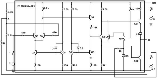 In order to verify the effectiveness of the proposed method, a database of 35 electronic circuits with multiple operating points was created based on the available literature and the author’s own experience. These circuits differ in fabrication technology (bipolar, MOS circuits), transistor models (Ebers–Moll and Gummel–Poon models for bipolar transistors, Level 1, Level 2, and BSIM for MOS transistors), IC macromodels, complexity, and the number of DC solutions. Four of these circuits are shown in Figure 1 and Figure 6, Figure 7 and Figure 8. The most-important parameters of the circuits and the results are summarized in Table 1. Cases corresponding to the circuits discussed in this work are marked in the Circuit type column with the number of the figure where the original schematic of the analyzed circuit is shown.