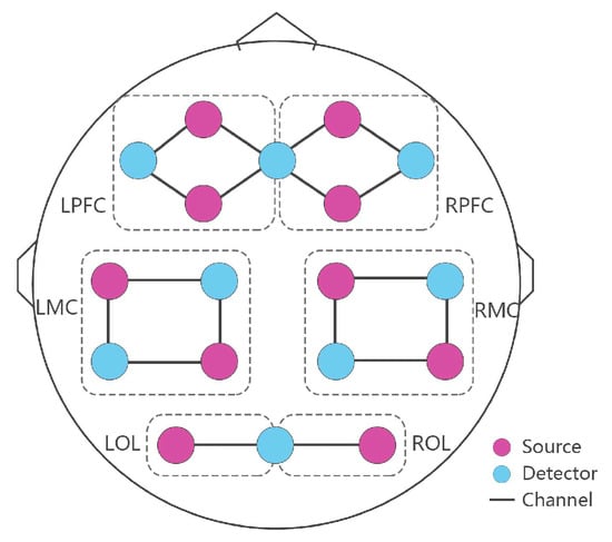 The fNIRS sampling device used in the experiments was NirSmart (Danyang Huichuang Medical Equipment Co., Ltd., Beijing, China), which has a frequency of 10 Hz and uses wavelengths of 740 and 850 nm. The distance between the optical poles was 30 mm. According to the requirements of the internationally accepted 10/20 electrode distribution system, 10 signal transmitters and 8 detectors were set on the electrode caps and divided into 18 channels. The electrodes were arranged in the left prefrontal cortex (LPFC), right prefrontal cortex (RPFC), left motor cortex (LMC), right motor cortex (RMC), left occipital cortex (LOL), and right occipital cortex (ROL). A flexible headgear fixator was used to fix the distance between the transmitter and the scalp to control the ambient light during the experiment and reduce the effect of excessive light on the experimental data.