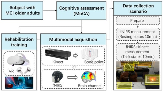 Although some studies have begun to evaluate products focusing on the cognitive and motor perspectives of brain function, many challenges remain. First, cognitive training products are still in their infancy, with a gradually increasing variety of training products appearing in various forms, such as physical and virtual products, and no standard training model. Second, the current assessment of training results produced by these products is not accurate enough, and the assessment tools that are used are not comprehensive. A cognitive assessment based on brain function is the current research trend, and due to the complexity of cognition, different scholars are trying to use richer multi-source data to evaluate cognitive training products, without forming a fixable evaluation system. Third, the training characteristics for MCI elderly are not clear, and targeted training cannot be conducted. Based on the above considerations, this study used fNIRS to identify changes in the brain hemoglobin concentration of test subjects while carrying out activities based on products in the VR environment with the help of the device’s multisensory features, combined with the Kinect device. This was used to obtain behavioral data from the test subjects. We aim to detect the cognitive and motor characteristics exhibited by MCI elderly people during the use of VR products, to determine whether the combination of multiple modalities, using fNIRS and Kinect as well as cognitive scales, can obtain a correlation between their data and some physiological representations of MCI elderly people while using VR products, as well as to enhance multiple forms of cognition with the use of these products.