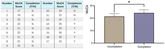 Table 1 shows the basic information. According to the assessment results, volunteers ranged from 17 to 28 points. Using the score set by the MoCA scale as the standard, twenty-six or more points was considered normal cognition; volunteers with MoCA scale scores ≤ 26 were screened for the experiment, and a total of 17 subjects were retained.